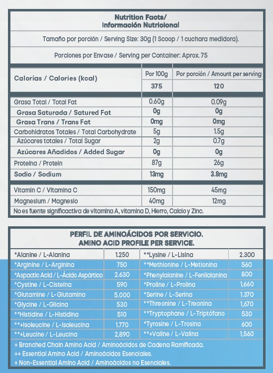 Proteína Limpia de suero de leche, contiene 75 servicios de 25 gramos de proteína cada uno
